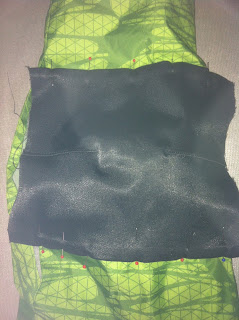Nu är det dag att sätta på knälappen, i det här fallet var det dessutom insnitt mitt på lappen på in och utsidan. Det har du gjort först. Jag vek in ca 1 cm i nederkanten och 1 cm där uppe. Nåla fast det på yttertyget, se till att det är slätt och inte drar någonstans.